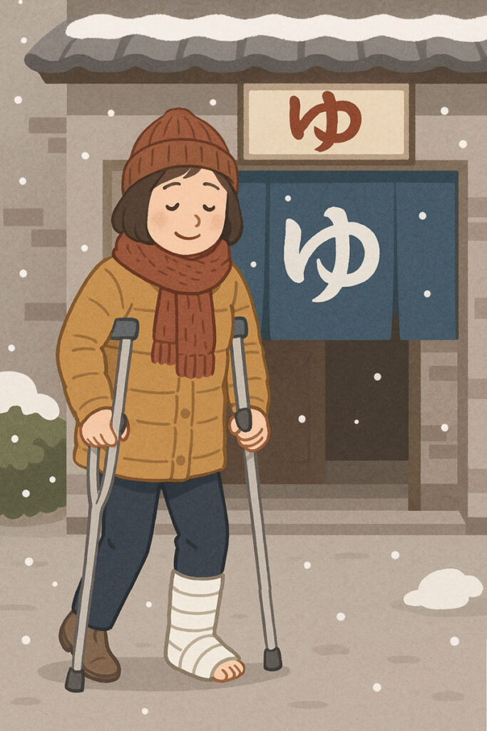 10分ほど浸かっただけで、こわばっていた足首がふっと軽くなるのを感じた。湯上がりには血の巡りが良くなったのか、松葉杖をつく手まで温かい。