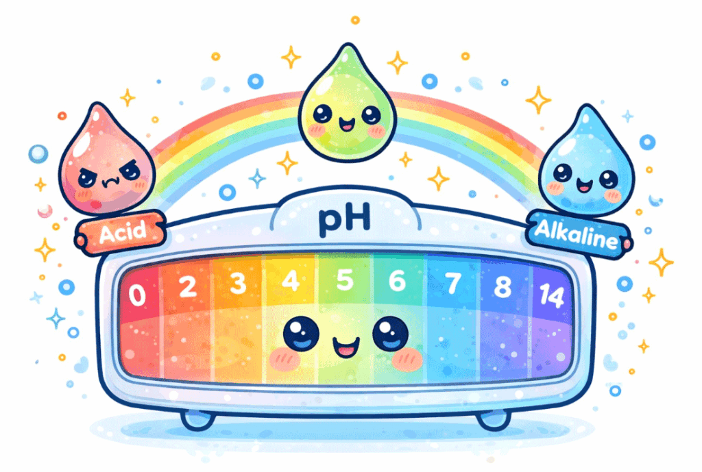 pHとは、酸性かアルカリ性かを示す指標。